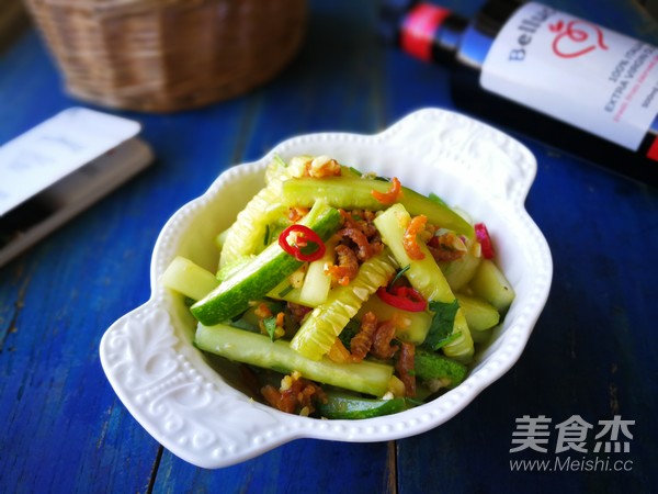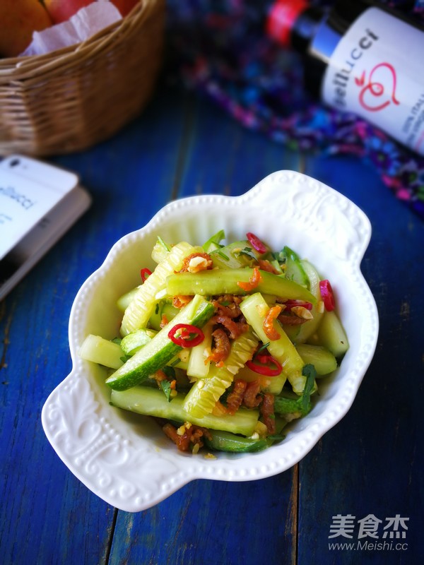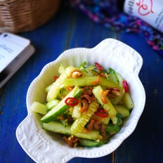 將調(diào)好的料汁倒入到黃瓜中,加入泡好的海米,翻拌均勻即可食用。