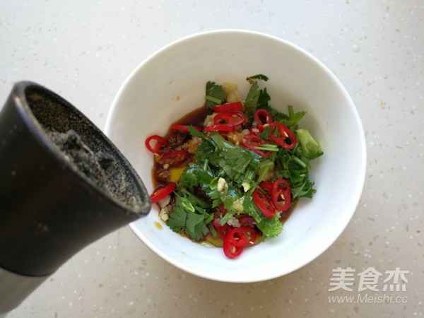 放入生抽,香醋,少許糖和黑胡椒碎拌勻。