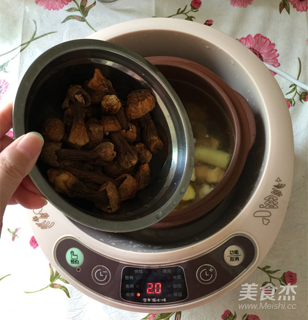 1:干松茸用溫水泡好,反復(fù)清洗去沙。