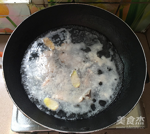3.鍋中加入水,放姜片和浸泡好的排骨,焯出血沫。
