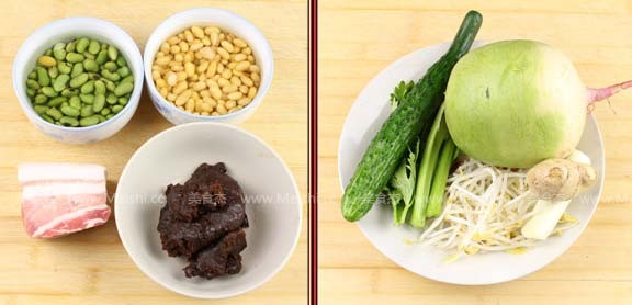 2.黃豆和青豆提前6小時泡上(如果來不及可以用開水泡1小時),然后放1個大料、10粒花椒和1克鹽煮軟煮香,黃瓜和心里美切絲、芹菜切粒焯一下、豆芽焯一下放好