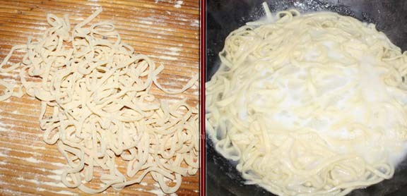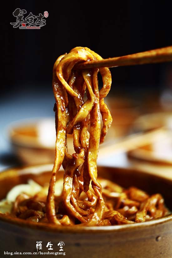 6.將面餅疊好切成條狀,然后放在沸水中煮熟,放上所有蔬菜及炸醬即可享用