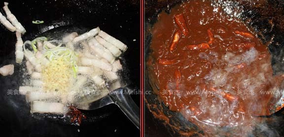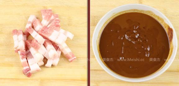 3.五花肉切?。ɡ媳本┱ㄡu都是肉丁炸,不用肉餡);黃醬用水調開(別太?。?/p>