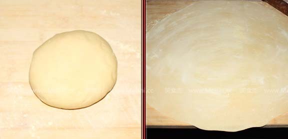 5.將面團放在案板生,搟成一張薄薄的面餅(厚度根據自己喜好自己掌握)