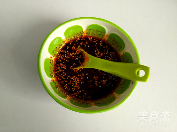4.準備好醋溜調料:陳醋2湯匙、生抽2湯匙、麻油1茶匙、辣椒油1茶匙、芝麻1茶匙、白砂糖1茶匙混合攪拌均勻(調料可以根據自己的口味適當調整);