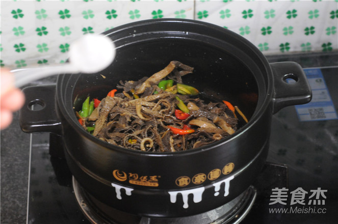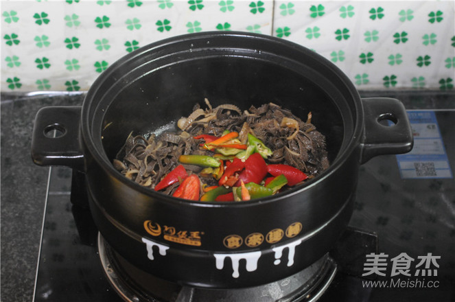 11.將炒好的毛肚倒在豆芽上,蓋上蓋子燜一分鐘就可以直接上桌了
