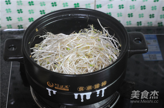 10.關(guān)火,砂鍋不用洗,直接將豆芽菜鋪在里面