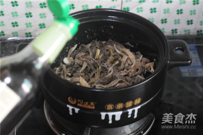 4.鍋燒熱,將毛肚倒進(jìn)鍋里,慢慢翻炒