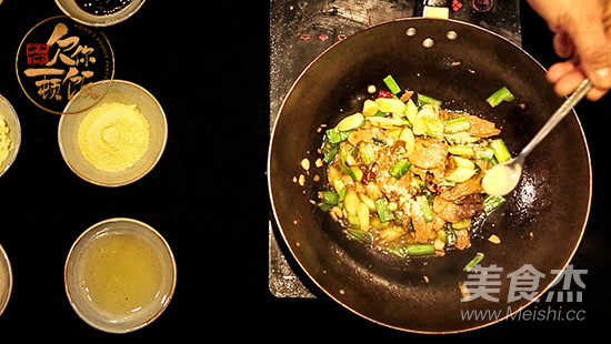 加入大蒜苗,在鍋中翻炒兩分鐘,加入一點水,加入雞精、胡椒
