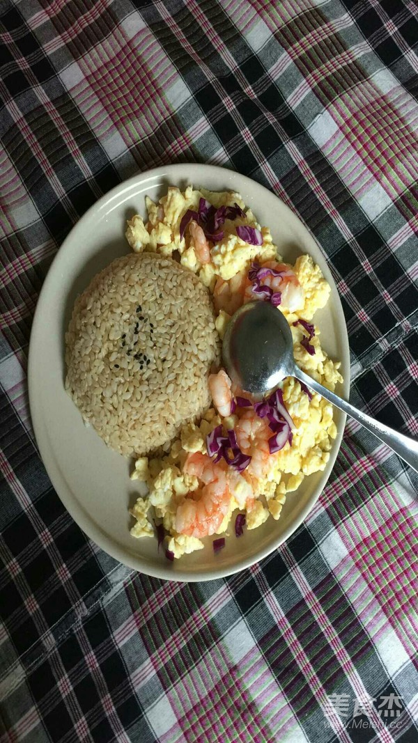 我是悶的糙米飯,因為男票健身所以就吃糙米好了,最后菜上可以撒點蔥花,家里沒蔥了就撒的紫甘藍也挺好看。鹽放多少根據自己口味,寧淡勿咸。雞蛋也很嫩,蝦也很嫩。
