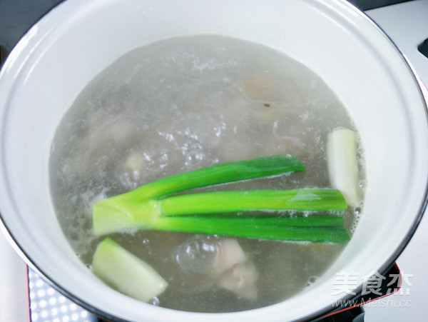 3.?水開(kāi)后,撈取表面浮沫。下蔥段、姜片、蒜瓣(蒜瓣用刀拍幾下容易出味)
