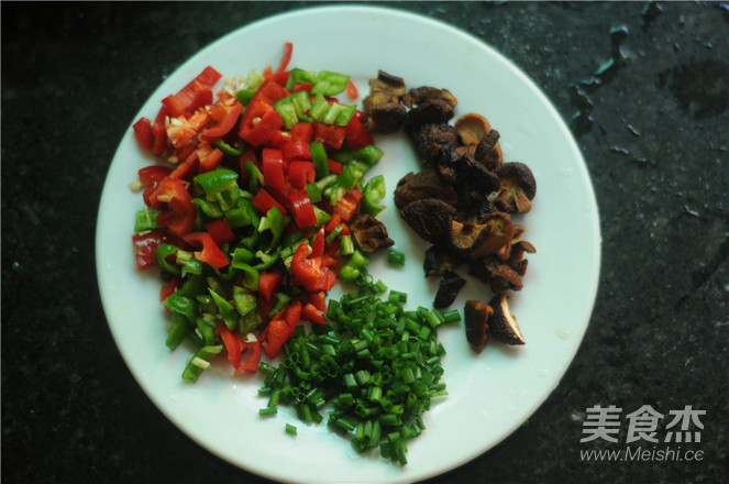 青紅椒去籽切丁、泡好的香菇也切成大小一樣的丁、蔥花姜絲切好