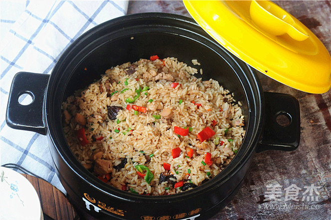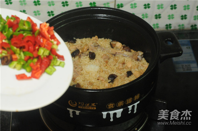 米飯煮好后開鍋,將青紅椒倒進去,翻拌均勻即可