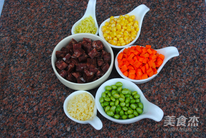 3.將臘腸和胡蘿卜切成小丁,準(zhǔn)備好玉米粒和毛豆,準(zhǔn)備好生姜末和大蒜末。