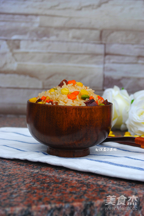 5.毛豆、玉米、紅蘿卜丁、風(fēng)干臘腸丁,一股腦兒倒入鍋里,翻炒2分鐘左右。