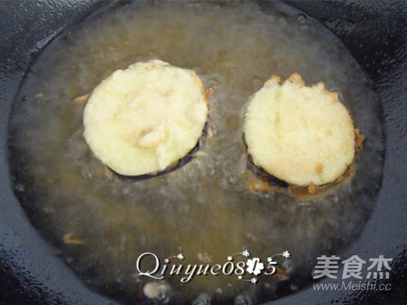 油熱六七分時放入茄盒坯炸至兩面金黃為宜