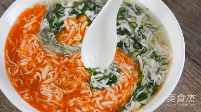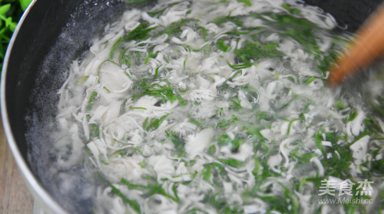 湯汁濃稠后,倒入豆腐絲、青菜絲,順時針拌勻
