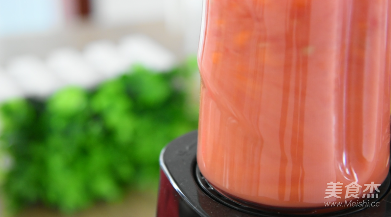將胡蘿卜丁、番茄丁放入大汁機種,打成汁