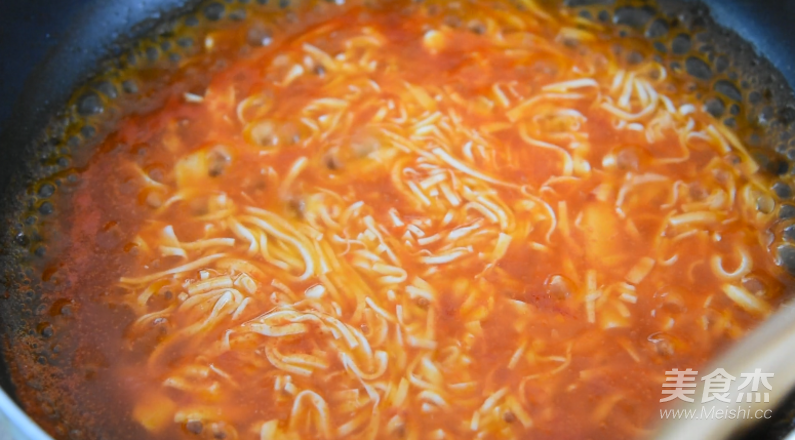 湯汁濃稠后,倒入豆腐絲,順時針拌勻