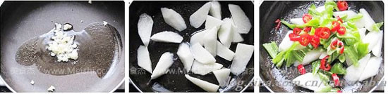 6.先下蒜泥煸炒出香味后放入山藥翻炒片刻馬上加入剁椒和青椒