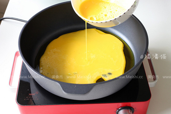 5.鍋里放入2大勺油,油熱后倒入蛋液,我用菜籽油炒的,好香