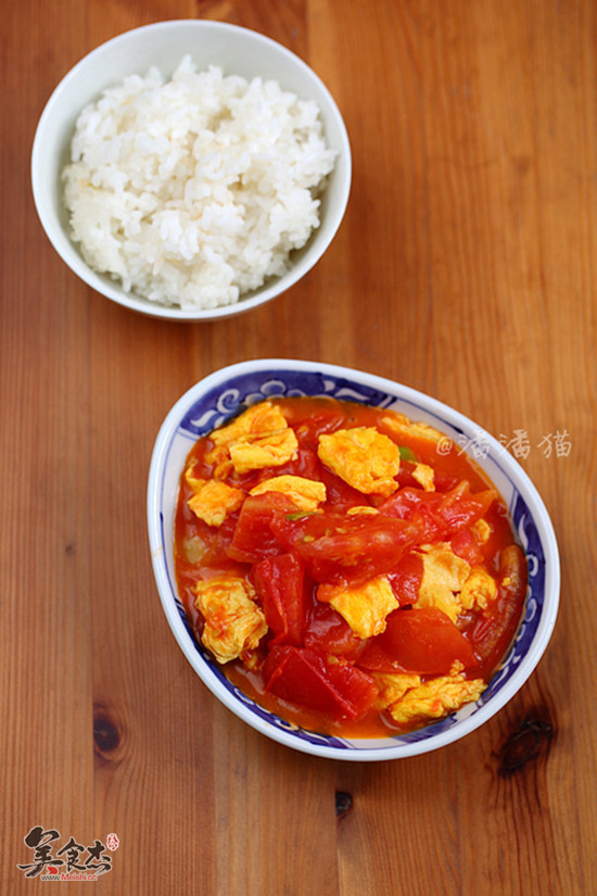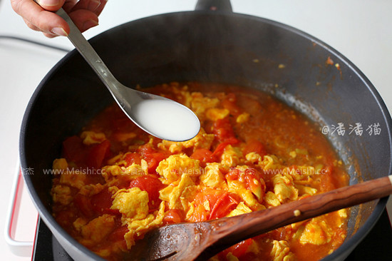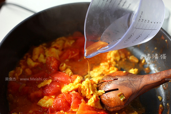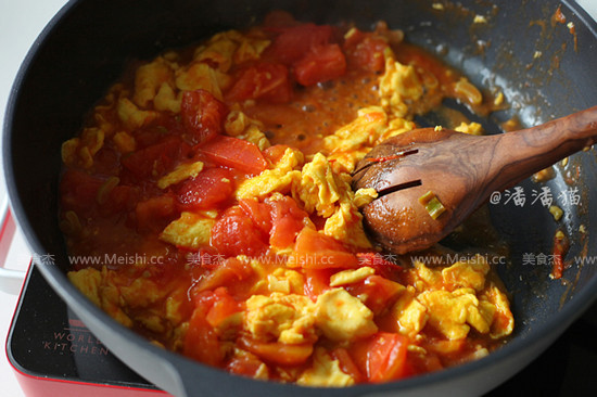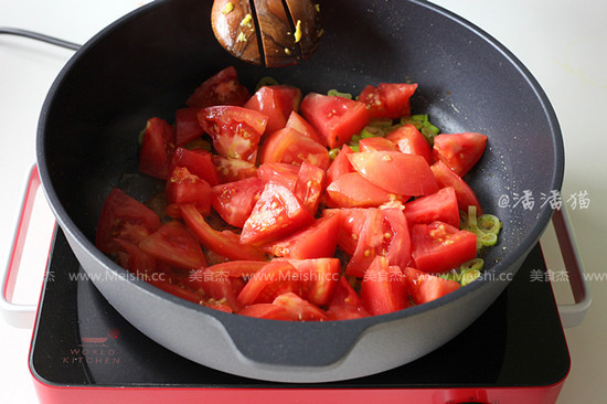 8.倒入西紅柿塊翻炒,直至西紅柿炒軟,湯汁溢出