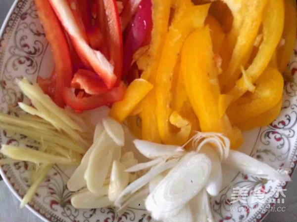 把彩椒洗干凈,切成絲,蒜片,姜絲,蔥片