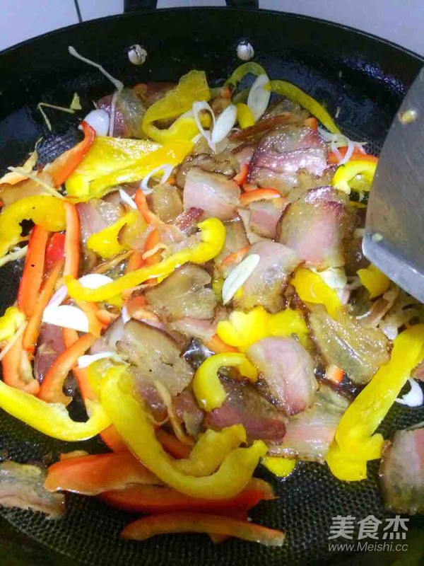 放入蔥姜蒜和彩椒絲翻炒兩分鐘
