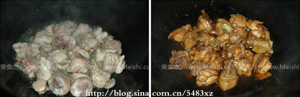 3.余油再次燒熱,放入蔥姜片爆香,倒入雞塊翻炒