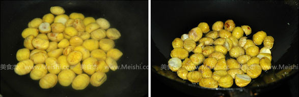 2.鍋中放油,油的量可以稍多點,放入板栗炒到表面變色后撈出備用