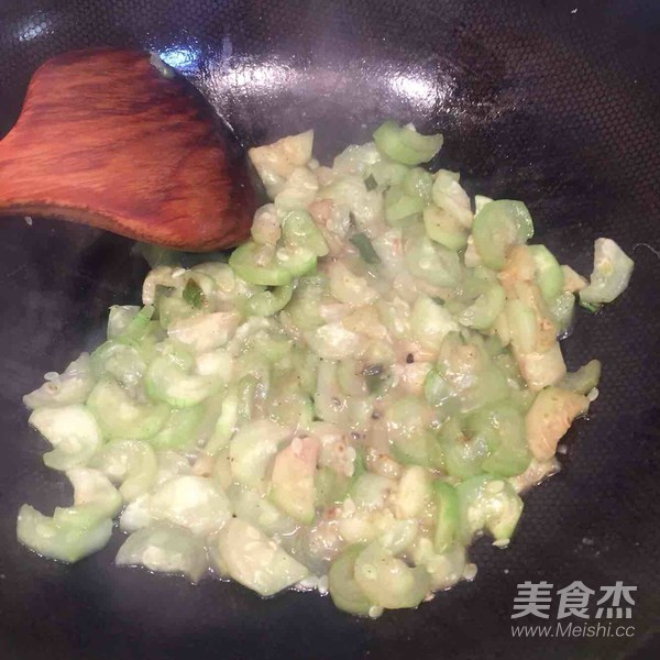 鍋里再放入油,蔥花、五香粉爆鍋,倒入絲瓜小火炒軟。