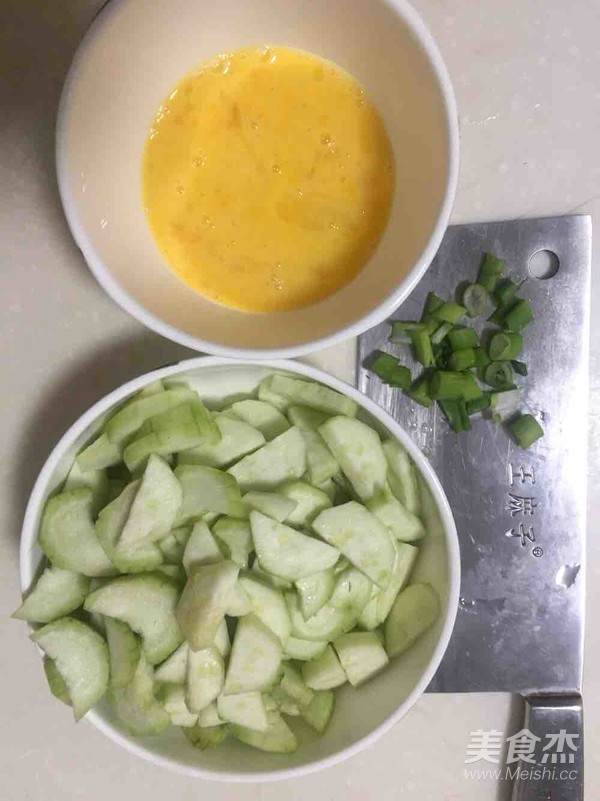 雞蛋打散,絲瓜切小塊,準備蔥花適量。