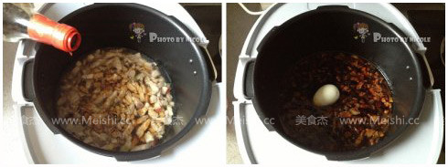 4.淋入料酒,炒約4分鐘后盛出,將炒好的五花肉和香菇碎一起倒入壓力煲中