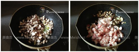 3.倒入香菇碎,煸炒2分鐘,然后將它們用鏟子撥到鍋的一側,放入五花肉煸炒