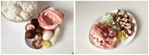 1.準備好食材,五花肉切短粗條,香菇切丁,蔥、姜都切成同等大小的碎末