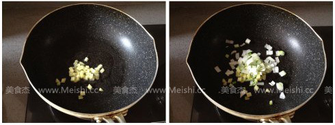 2.鍋中倒入油,先將姜末放入煸炒,煸出香味后,再放入蔥末炒香
