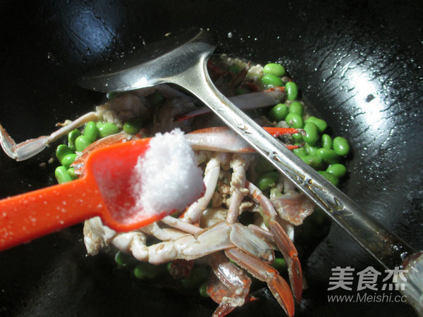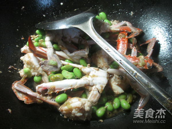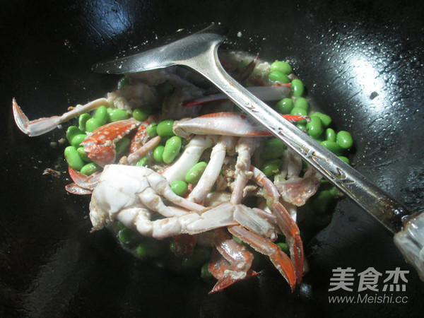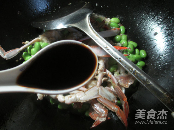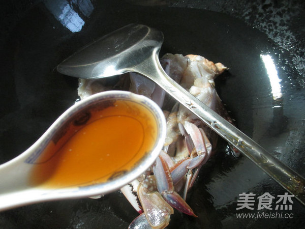 燒鍋4湯勺油燒熱,下入收拾好的螃蟹,加1湯勺料酒。