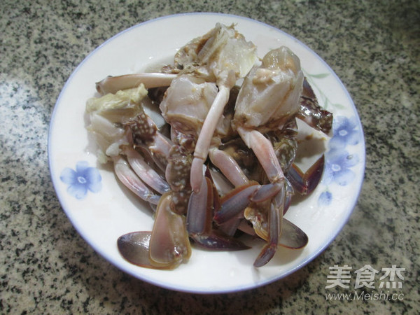 將已清洗的螃蟹去蟹殼去鰓剪開,待用。