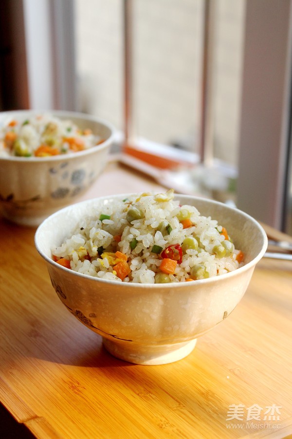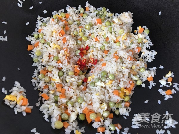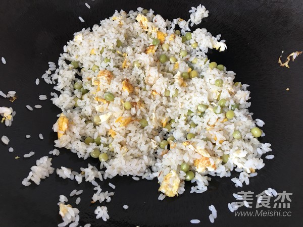 把米飯炒散一些加入煮熟的豌豆一起炒均勻片刻