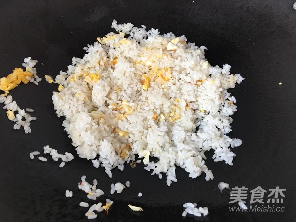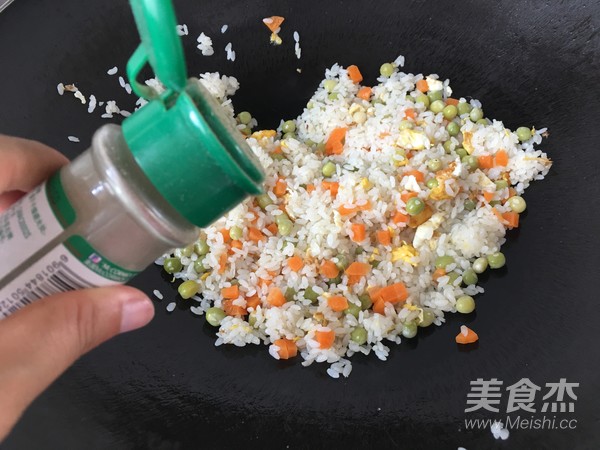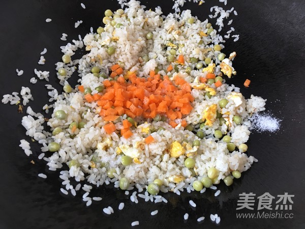 加入切好的糊蘿卜粒兒,仍然炒散米飯均勻開,加一勺鹽調味