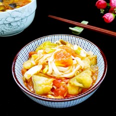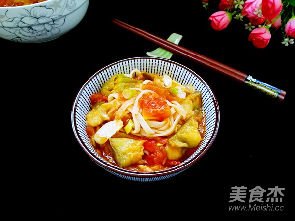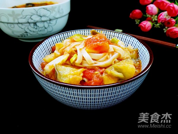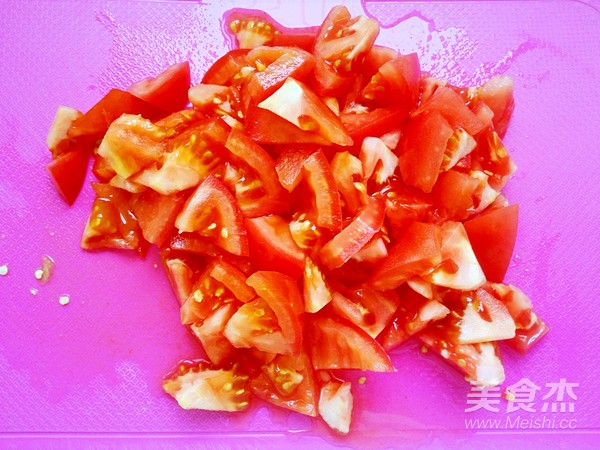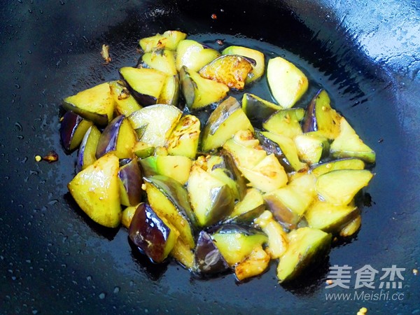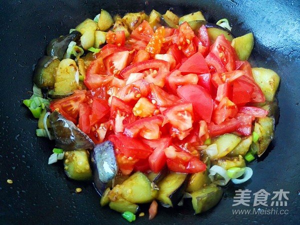 將茄子趕到四周,中間放入西紅柿,用炒勺壓炒出汁