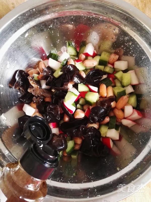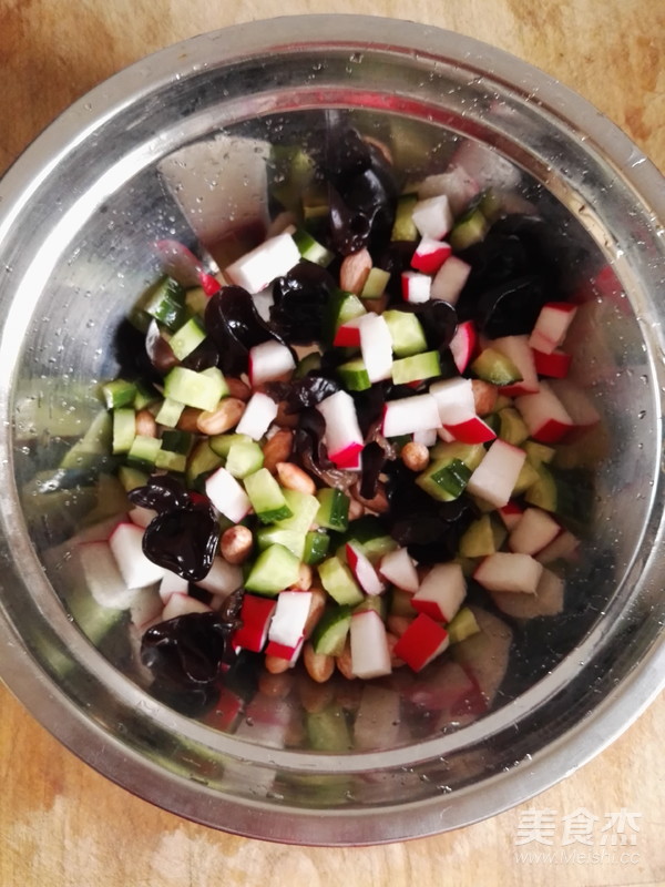 花生、黑木耳、黃瓜和水蘿卜倒入盆中,混合