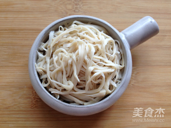 2、杏鮑菇焯水后一定要把水分擠干,這樣才能充分的吸入調味汁