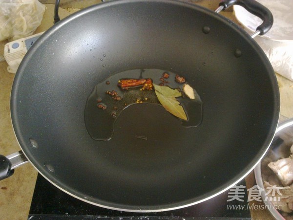 鍋里倒入油,放入花椒、大料、香葉、桂皮。
