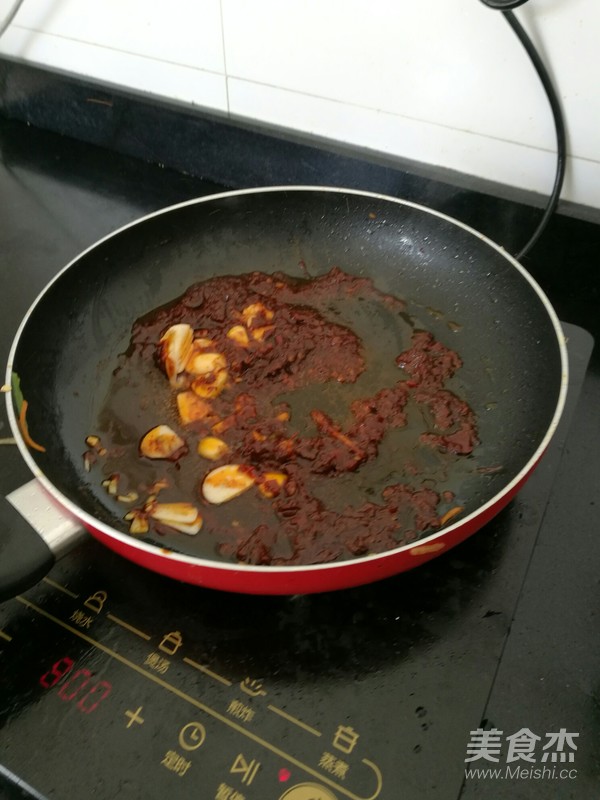 鍋中放少許油,開小火放入豆瓣醬,蒜末,姜末炒出紅油