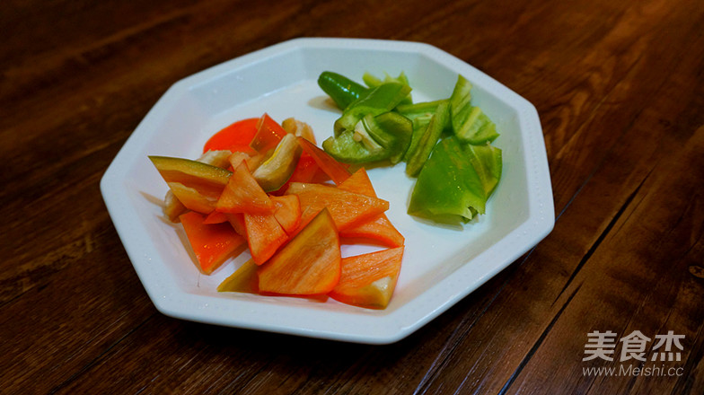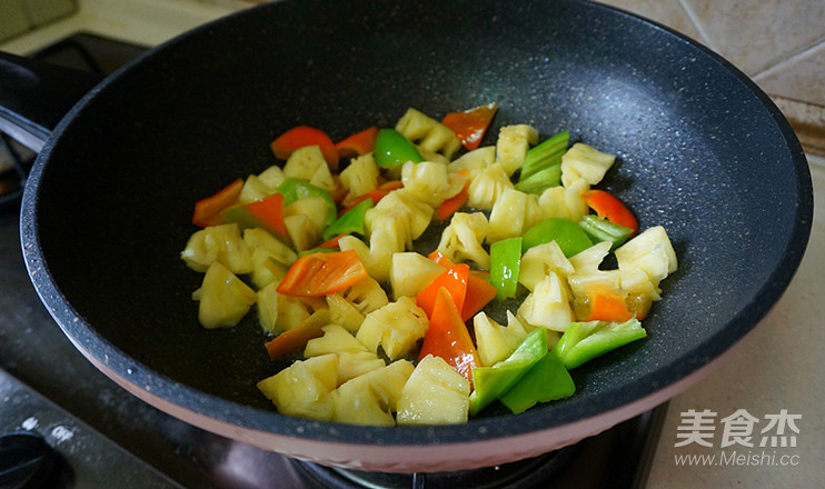 15.鍋里放一些油,青椒菠蘿炒至六七分熟撈起來待用