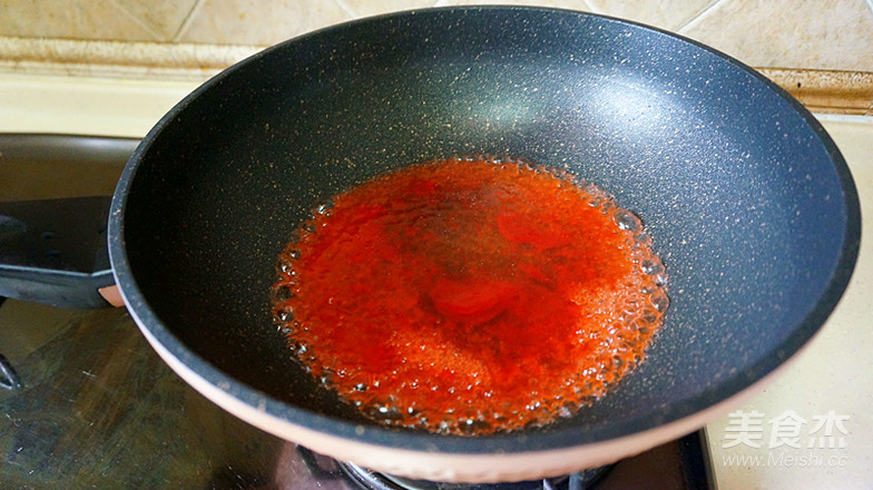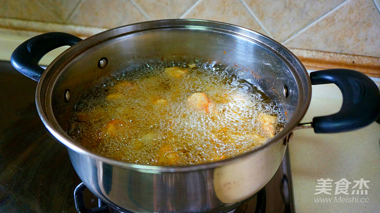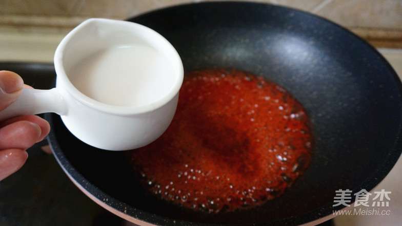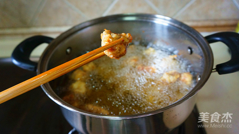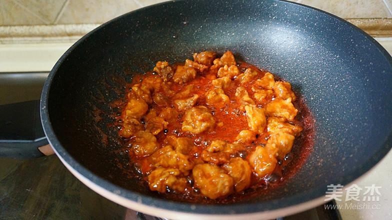 18.等汁兒完全融合后放入炸好的肉,翻炒至全部裹上醬汁