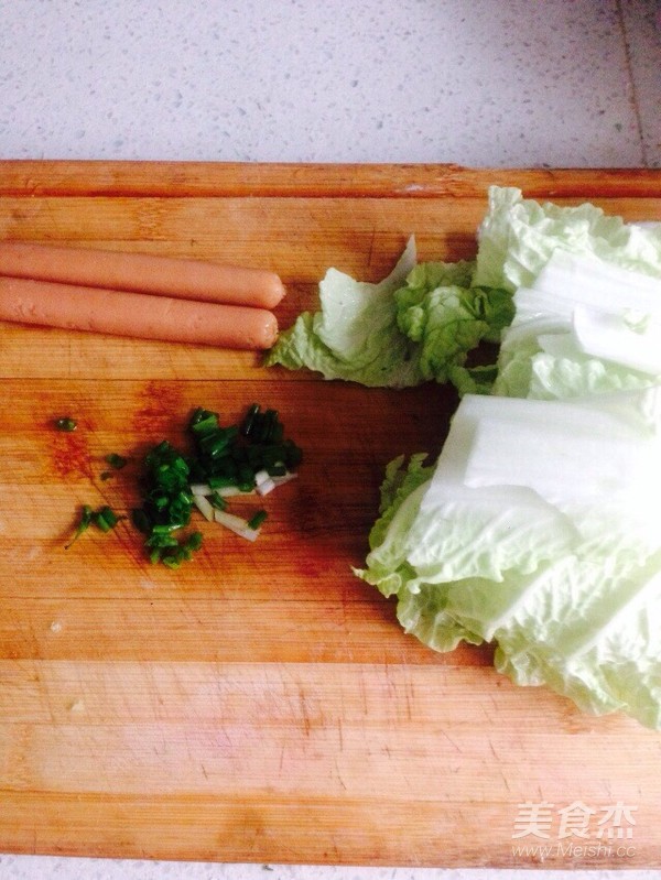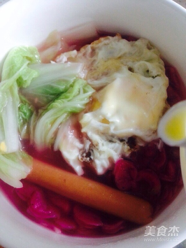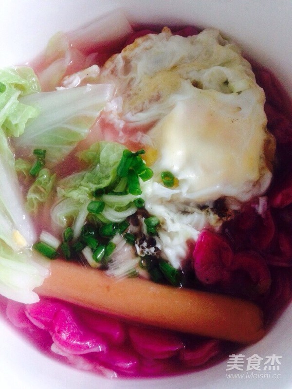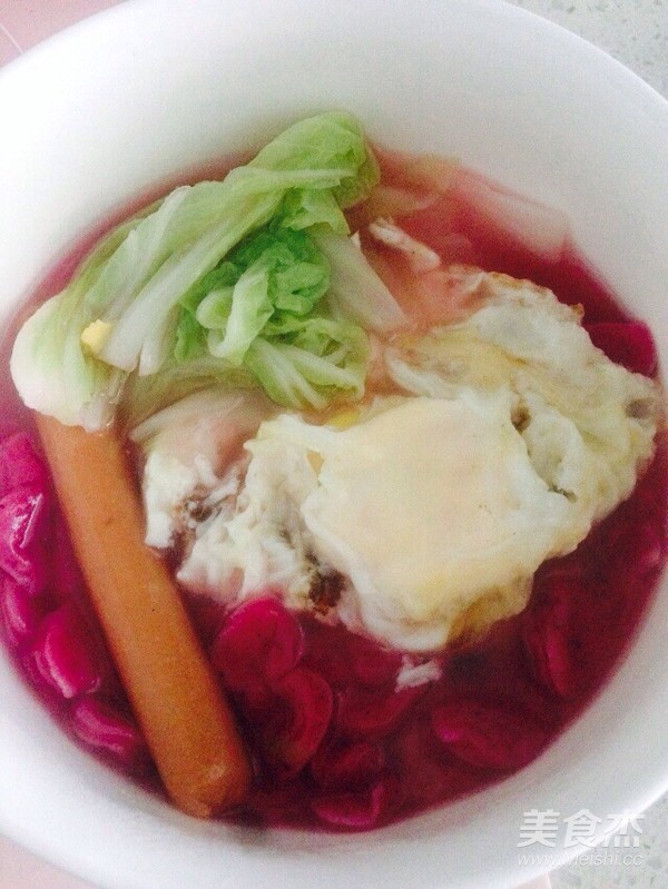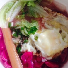 把蝴蝶面放入醬汁湯中,放入火腿腸,白菜和荷包蛋
