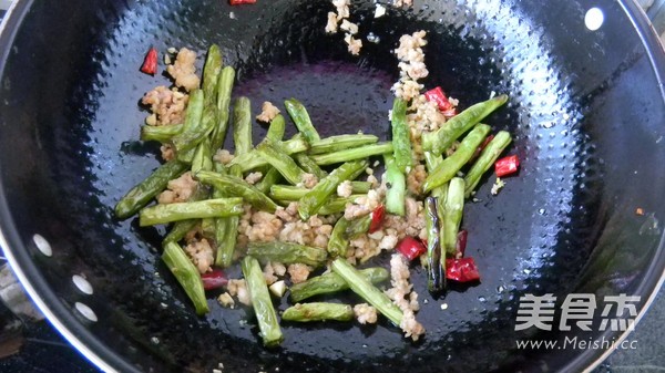 加入四季豆,最后加入醬油、料酒、白糖、食鹽翻炒入味即可