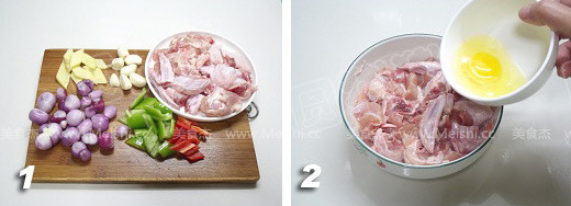 1.雞斬小塊,干蔥(紅蔥頭)去皮,生姜切片,大蒜去皮拍碎,青紅椒切菱形塊